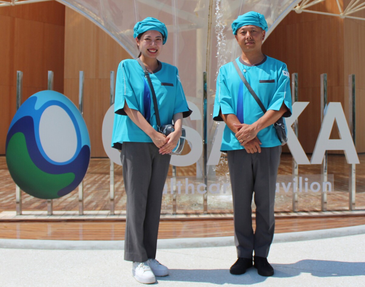 パビリオン内での勤務と異なり、屋外を移動しながらのご案内業務のため、シンプルでありながら視認性に優れたデザインで、シワになりにくいイージーケアのユニフォームが求められます。