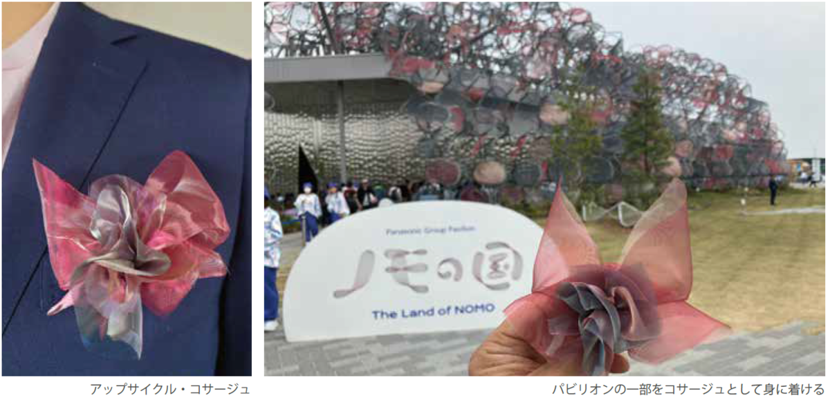 今回は、パナソニックグループパビリオン「ノモの国」のユニフォームの端材、残布を使ってラッピングしました。