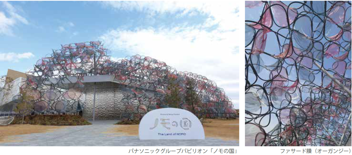 パナソニックグループパビリオン「ノモの国」は、建築家・永山祐子氏による設計、デザインです。有機的、かつ幻想的なファサードは、循環を表す立体形状の「モチーフ」を約1,400 個を組み合わせて全体を形成しています。