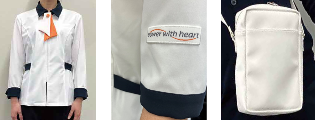 首元にはネクタイ風のリボンをあしらうことで、VIP のご案内に対応できるしっかりとした印象を、関西電力グループのブランドステートメント「power with heart」のロゴに使用されているエンパワーリングオレンジとネイビーとの配色で、若々しい印象を与えるデザインとしました。