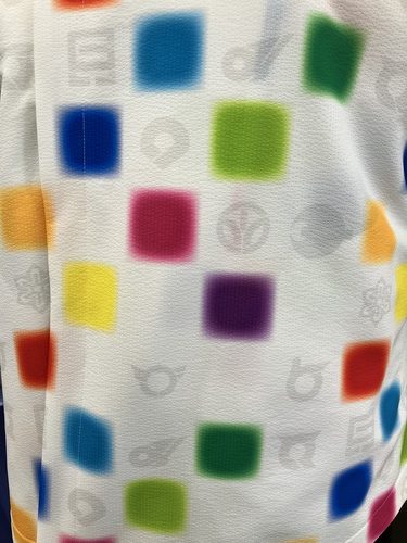 関西全体を表現する展示エリア「大関西広場」のアテンド業務を担うスタッフのユニフォームは、日本の伝統的な市松模様をベースにポップな色合いのプリント柄で、お祭りである万博の楽しさを表現。ひとつひとつのマス目をぼかし、関西パビリオンに出展する各府県の県(府)章を配置し、特色ある府県同士のグラデーションのようなつながりを表現しています。